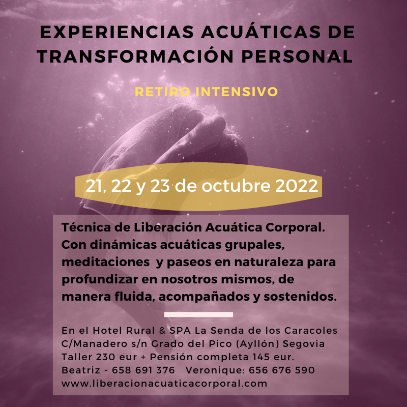 Esperiencias acuáticas de transformación personal. Hola! Somos Beatriz y Véronique y os compartimos esta maravillosa oportunidad para profundizar en la verdad de nosotros mismos, para nuestro autoconocimiento de forma sencilla y fluida gracias a las sucesivas experiencias acuáticas y a otras dinámicas y actividades. En nuestros retiros de Liberación Acuática Corporal experimentamos la Conciencia Líquida, EL AGUA, que nos pone en contacto con nuevas posibilidades desde la propia experiencia, y estos aprendizajes quedan ya impresos en nuestro cuerpo a nivel físico, bioquímico y energético para apoyarnos en nuestra transformación.